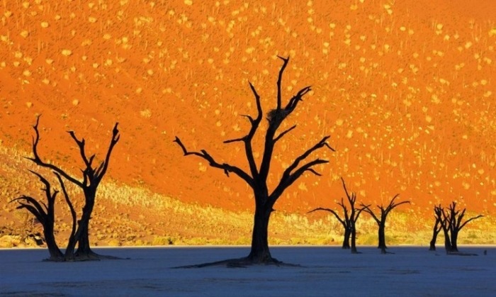 세상에서 가장 거대한 모래언덕 아래 '죽음의 계곡'에서 죽은 나무들을 찍은 사진입니다.