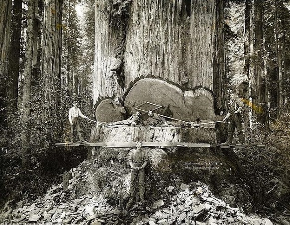 캘리포니아에서 벌목꾼들이 1000년도 넘은 Redwood를 자르고 있다.