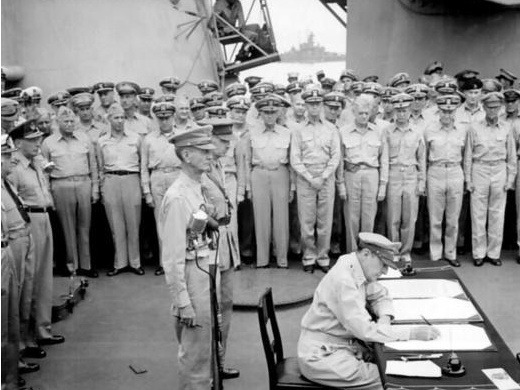 미국 군함 Missouri 선상에서 일본의 항복 문서에 서명하고 있는